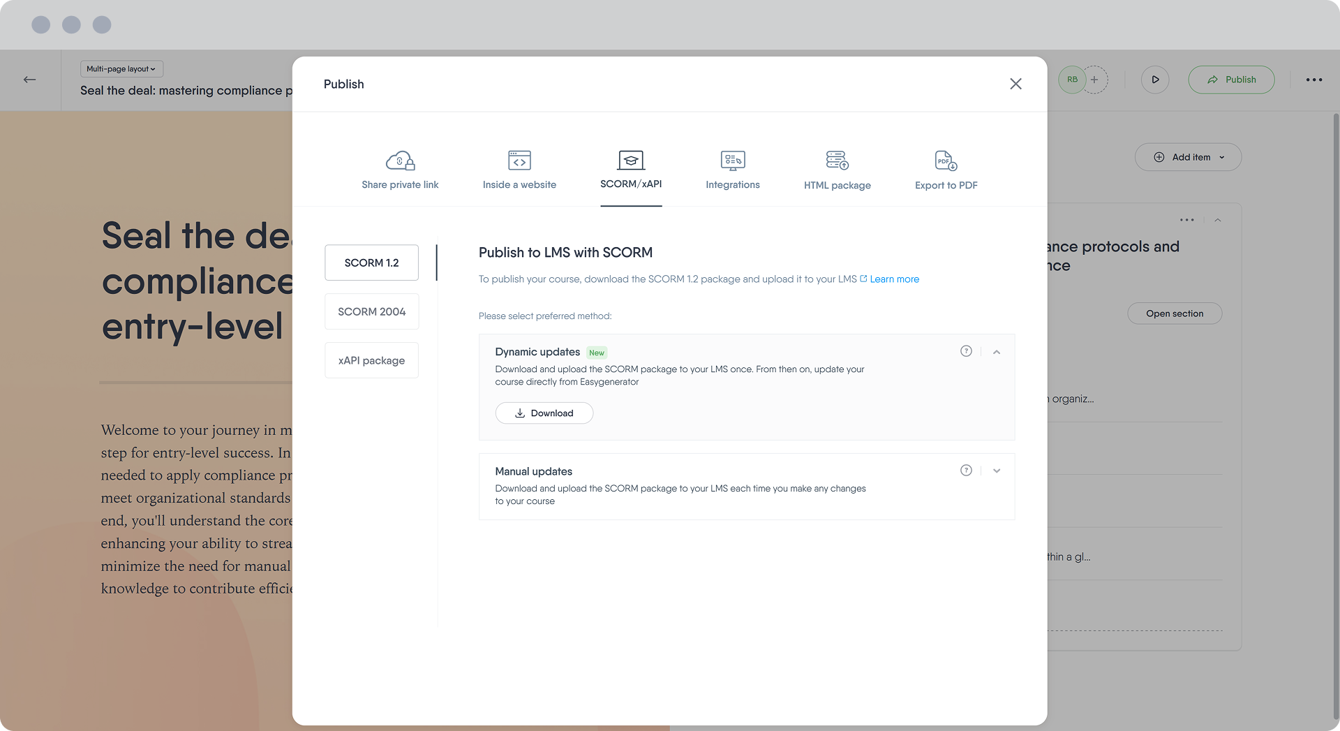 - Distribution Options: SCORM export (dynamic or manual), LMS integrations, private links, PDF export, and embed options.